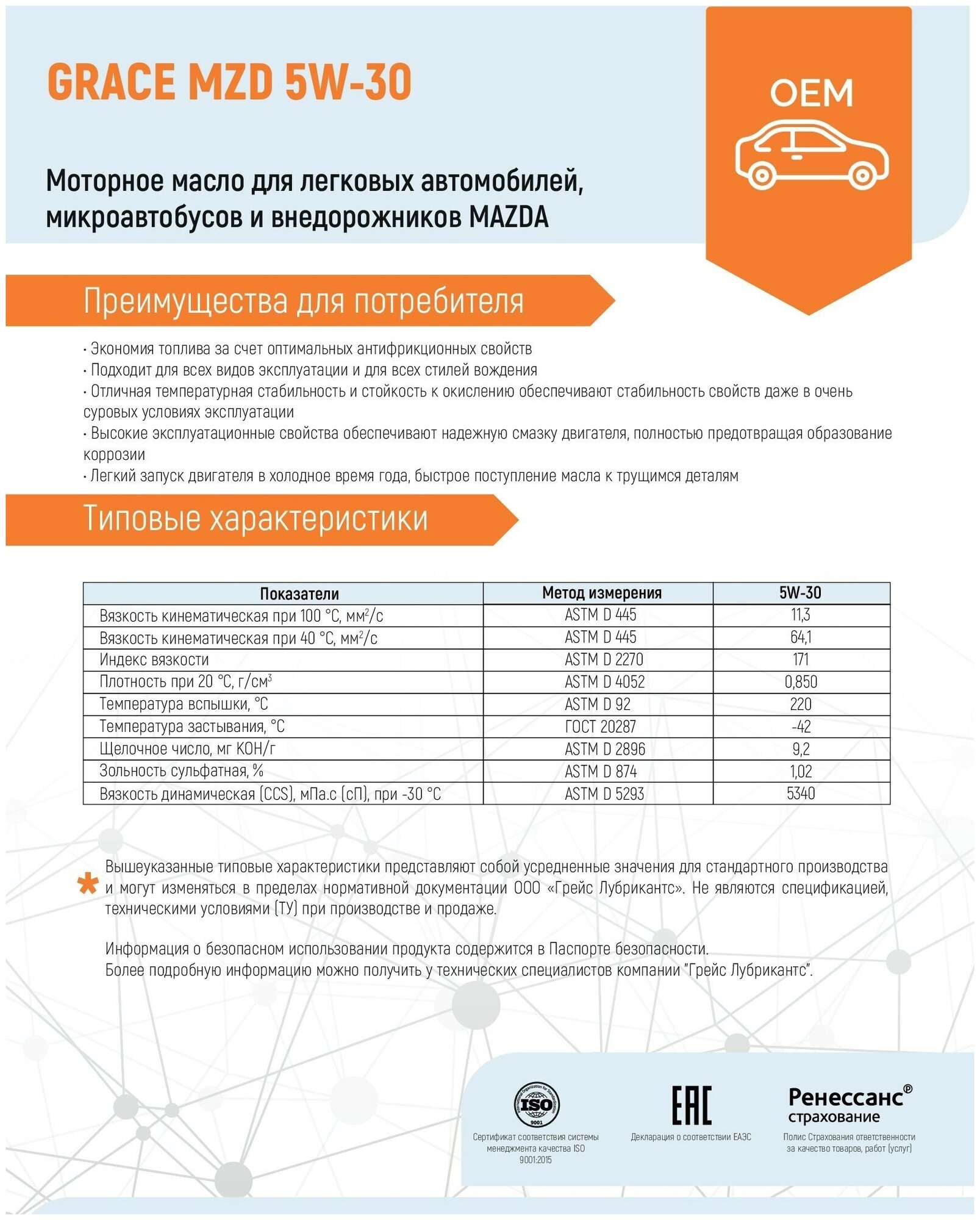 Синтетическое моторное масло Grace Lubricants MZD 5W-30, 1 л интересное: