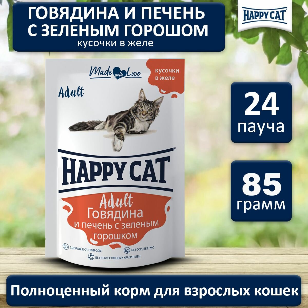 Happy Cat влажный корм для взрослых кошек с говядиной, печенью и горохом в желе, в паучах - 100 г