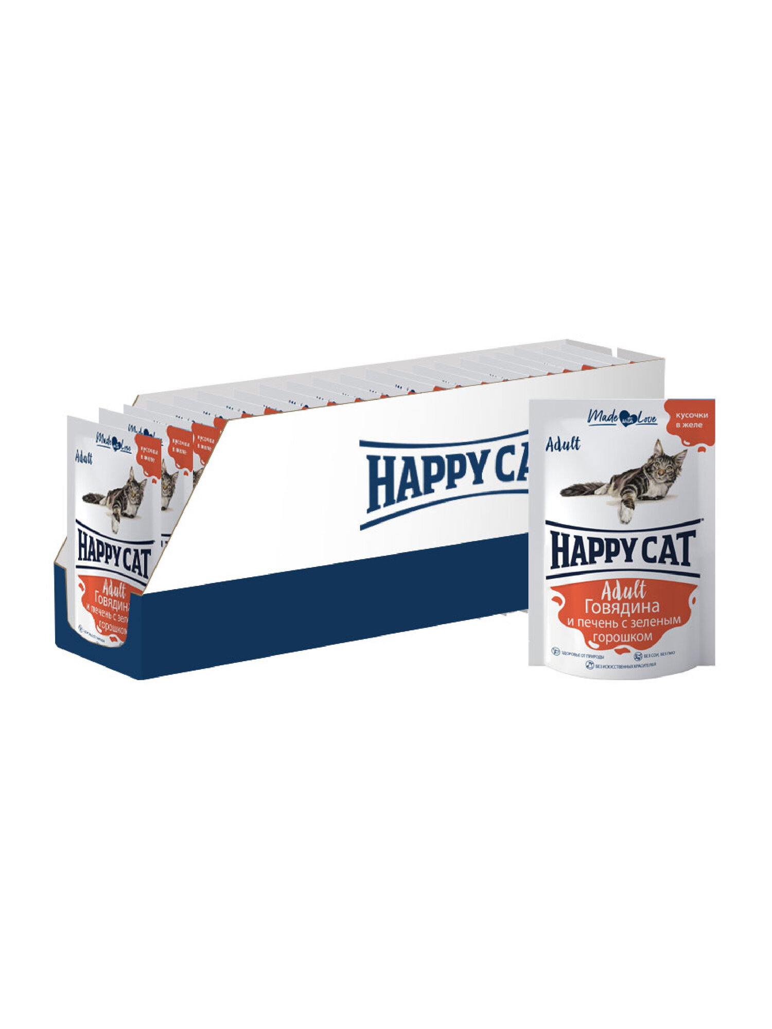 Паучи Happy Cat Хэппи Кэт для кошек любых пород, говядина печень горох в желе (24шт х 100гр)