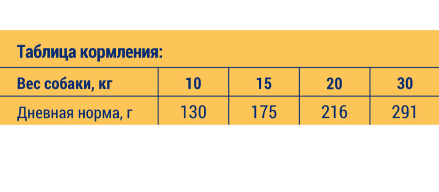 | Дозировка | - вес собаки 10 кг - 112 г - вес собаки 15 кг - 152 г - вес собаки 20 кг - 189 г - вес собаки 25 кг - 223 г |
