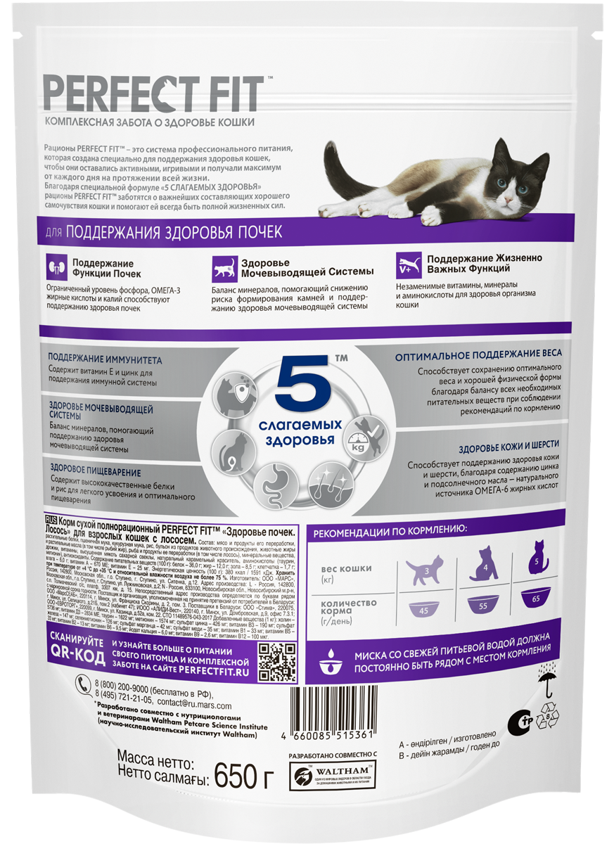 Корм сухой Perfect Fit для взрослых кошек, для поддержания здоровья почек, с лососем, 650 г