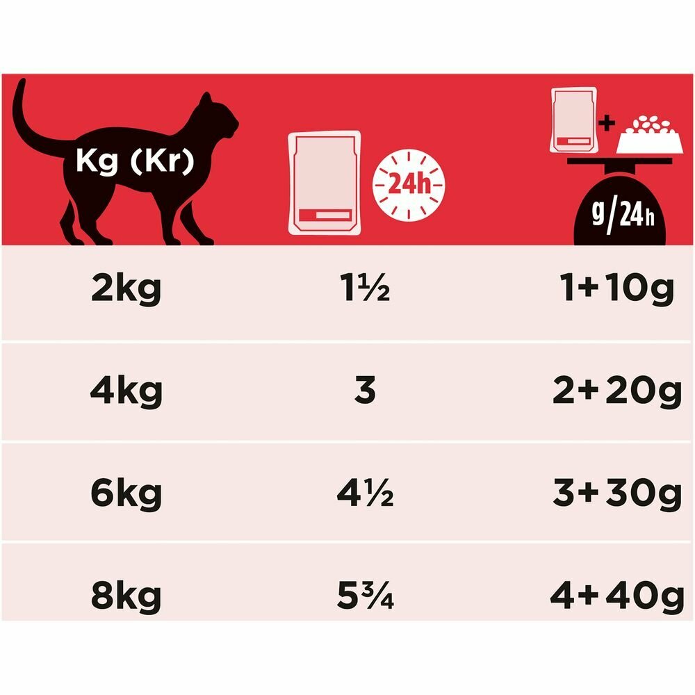 | Дополнительная информация | рекомендуемая начальная продолжительность кормления – до 6 месяцев; следите, чтобы у кошки всегда была чистая питьевая вода; 1 пауч = 21 г сухого корма DM для кошек; указанное количество корма является исключительно рекомендованным; перед применением диеты рекомендуется посоветоваться с ветеринарным врачом |