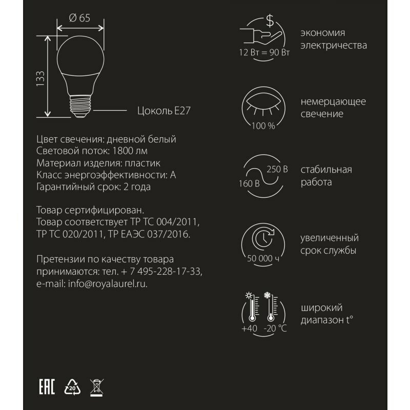 | Эквивалент лампы накаливания | 50 Вт |