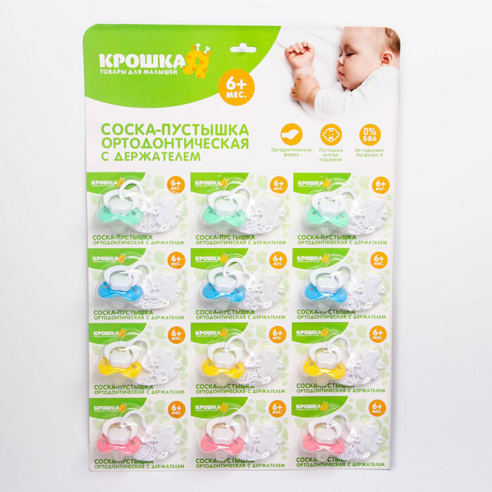 Пустышка ортодонтическая, с держателем, +6мес., на блистере, цвет микс (комплект из 12 шт)