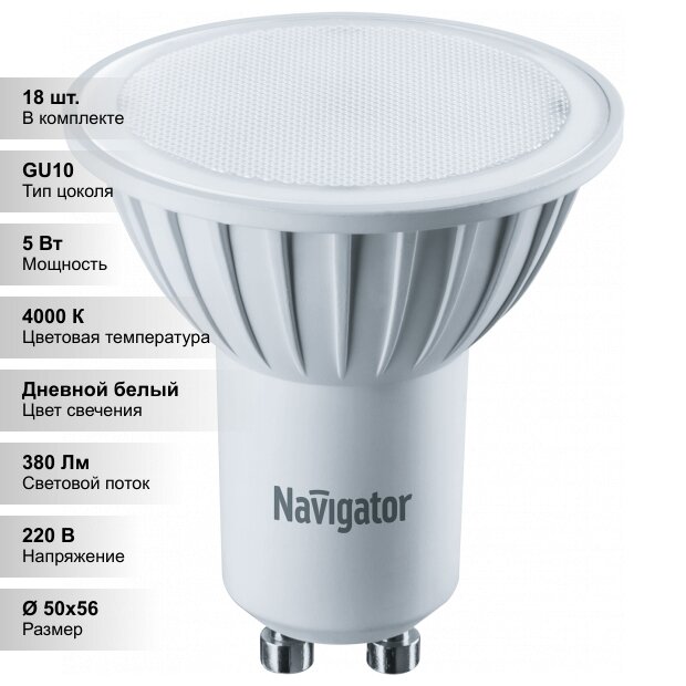 Купить (18 шт.) Светодиодная лампочка Navigator PAR16, мощность 5 Вт, напряжение питания 220 В, цветовая температура 4000 K, нейтральный белый свет, цоколь GU10, размер 50х59 мм, NLL-PAR16-5-230-4K-GU10