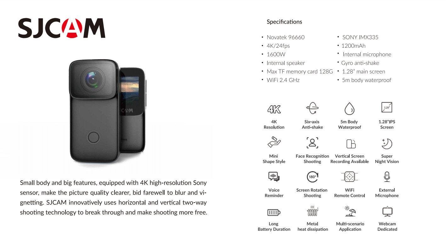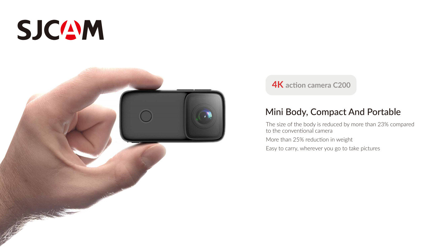 Экшн-камера SJCAM C200 видео до 4K/24FPS, SONY IMX335, экран 1.28", встроенный микрофон, microSD до 128 гб, батарея 1200 мАч, WiFi