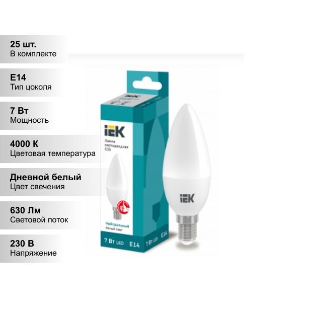 10шт/уп. Лампа LED Свеча 7Вт 230B C35 E14 630Лм 4000К Свет Нейтральный белый арт. LLE-C35-7-230-40-E14 IEK, уп. 10шт