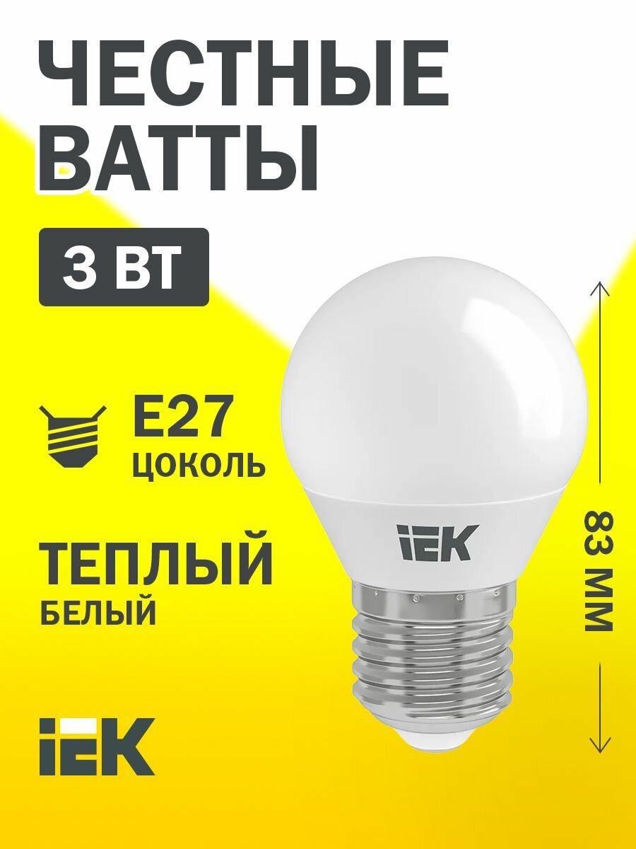 (18 шт.) Светодиодная лампочка IEK G45, мощность 3Вт, напряжение питания 230В, цветовая температура 3000К, теплый белый свет, цоколь E27, размер 45х83 мм, LLE-G45-3-230-30-E27