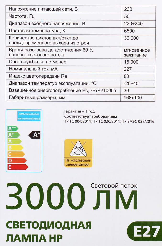 | Световой поток | 3000 лм |