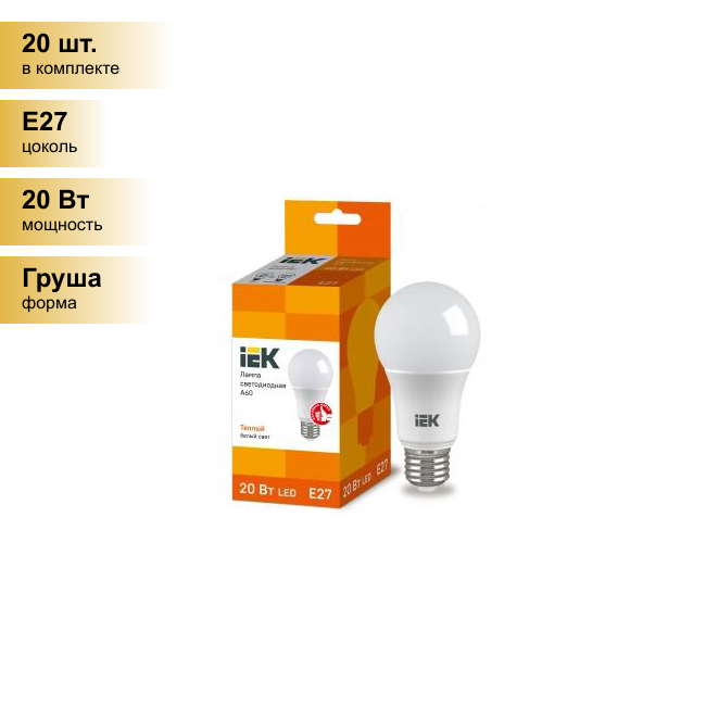 10шт/уп. Лампа LED Груша 20Вт 230B A60 E27 1800Лм 3000К Свет Теплый белый арт. LLE-A60-20-230-30-E27 IEK, уп. 10шт