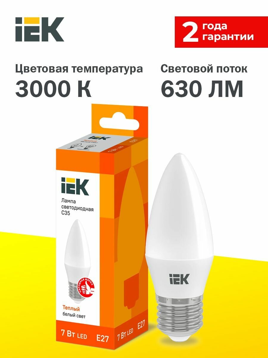 Купить Лампа светодиодная E27, 7 Вт, 60 Вт, 230 В, свеча, 3000 К, свет теплый белый, IEK, C35, LED