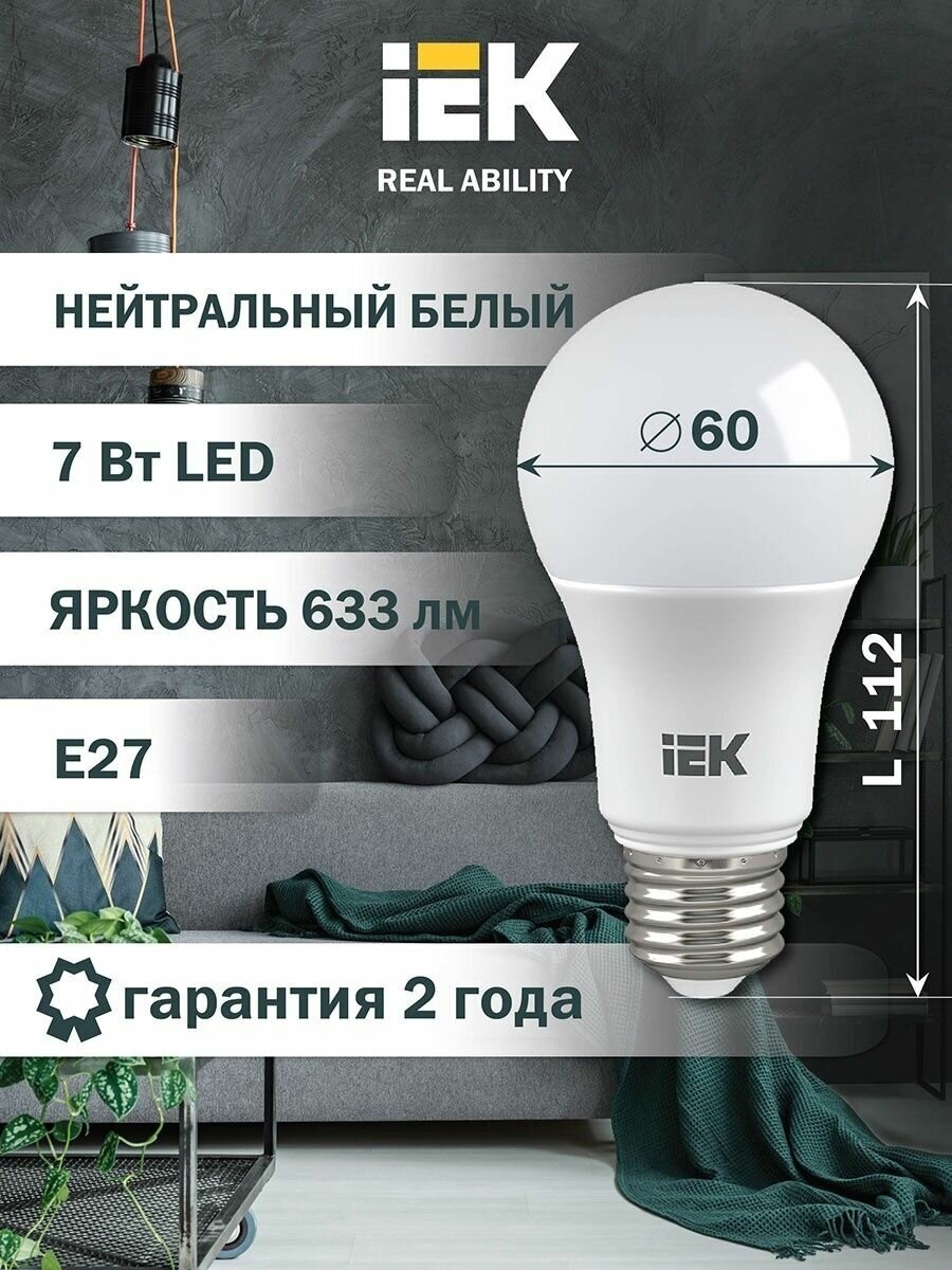 (5 шт.) Светодиодная лампочка IEK ЛОН A60 E27 7W(630lm) 4000K 4K 108x60 матов. ECO LLE-A60-7-230-40-E27 Нейтральный белый. Цоколь E27