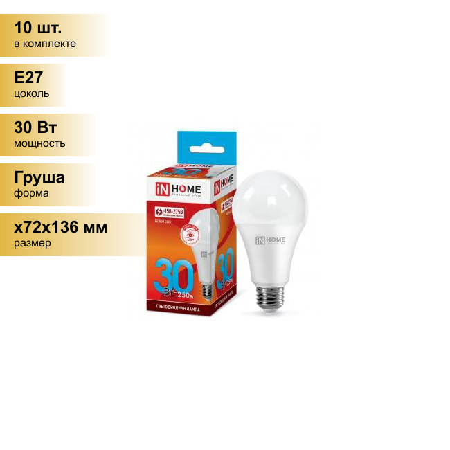 (10 шт.) Светодиодная лампочка ASD/inHome VC ЛОН A70 E27 30W(2700lm) 4000К 4K 135x70 (без пульсации) 4141 Нейтральный белый. Цоколь E27