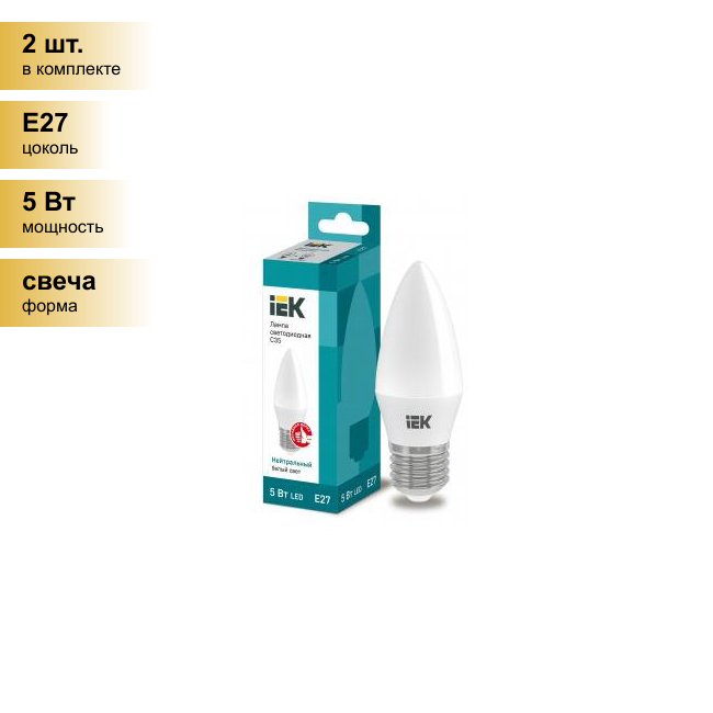 Купить (2 шт.) Светодиодная лампочка IEK свеча C35 E27 5W(450lm) 4000K 4K 100x35 матов. ECO LLE-C35-5-230-40-E27 . Цоколь E27