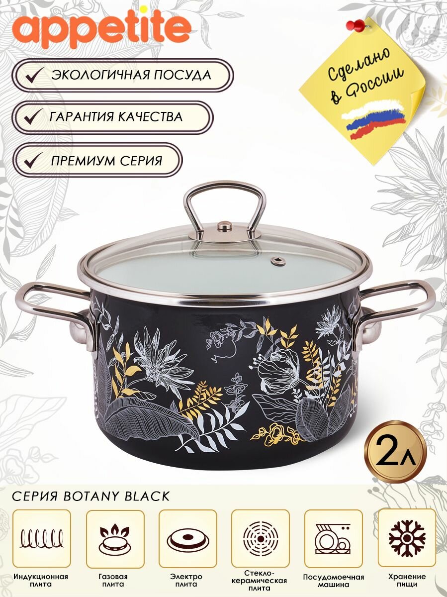 Кастрюля эмалированная Appetite Botany black, с крышкой, 2 л