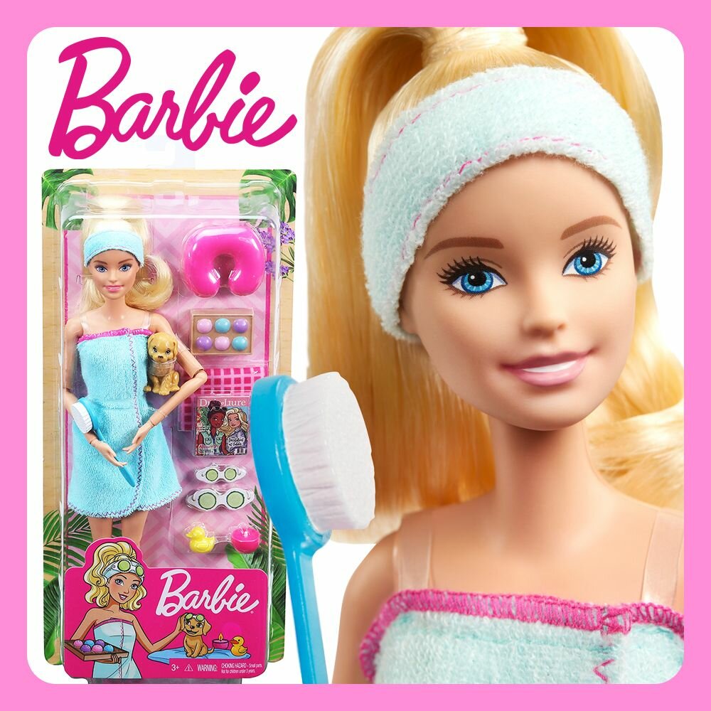 Кукла Barbie GJG55 Wellness Spa, блондинка, со щенком и 9 аксессуарами, включая подушку для шеи, резиновую уточку и маску для глаз в виде огурца, игрушка в подарок для детей от 3 до 7 лет
