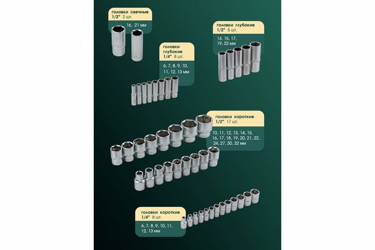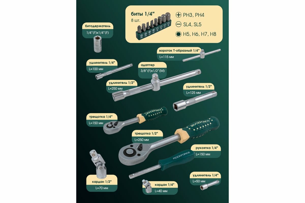 | Головки торцевые подробно | 1/2": 14, 15, 16, 17, 18, 19, 20, 22, 24, 27, 30, 32 мм; свечные 1/2": 16, 21 мм; 1/4": 4, 4.5, 5, 5.5, 6, 7, 8, 9, 10, 11, 12, 13, 14 мм; с битами 1/4": H3, H4, H5, H6, T8, T10, T15, T20, T25, T30, SL4, SL5.5, SL7, PH1, PH2, PZ1, PZ2; адаптер 3/8"(F)x1/2"(M); трещотка 1/2"; карданный шарнир 1/2"; удлинитель 1/2": 125, 250 мм; удлинитель 1/4": 50, 100 мм; гибкий удлинитель 1/4"; карданный шарнир 1/4"; трещотка 1/4"; держатель биты 1/2"x5/16" |