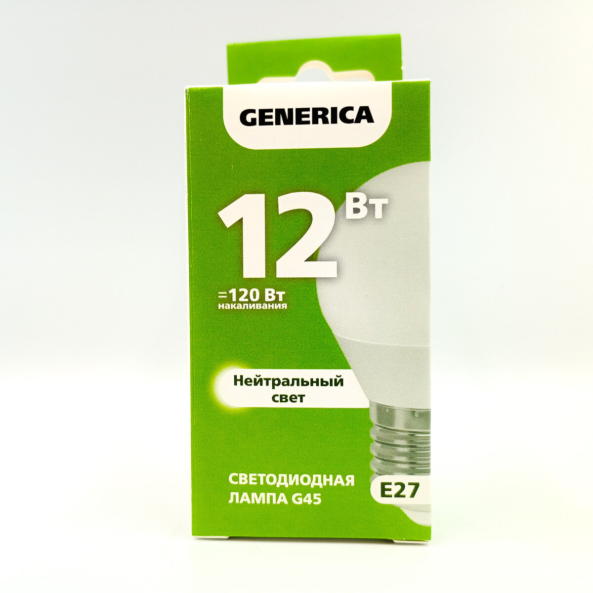 Купить (6 шт.) Светодиодная лампочка GENERICA LED G45 шар, мощность 12 Вт, напряжение питания 220 В, цветовая температура 4000 К, нейтральный белый свет, цоколь E27, размер 45х81 мм