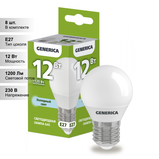 GENERICA Лампа светодиодная GENERICA G45, 12 Вт, шар, 6500 К, E27 230 В, LL-G45-12-230-65-E27-G