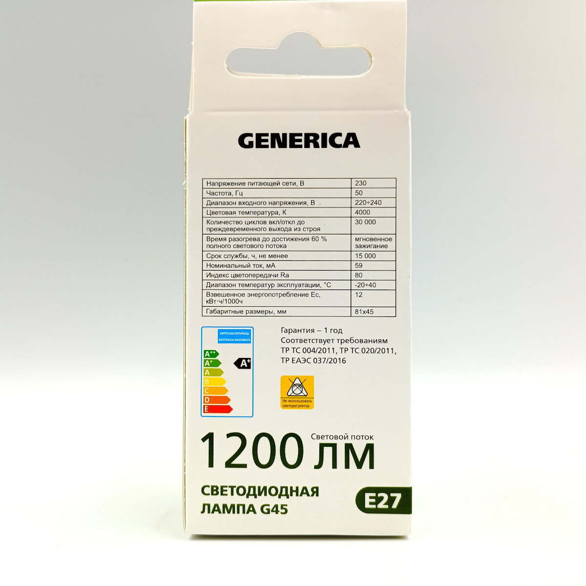 Купить (14 шт.) Светодиодная лампочка GENERICA LED G45 шар, мощность 12 Вт, напряжение питания 220 В, цветовая температура 4000 К, нейтральный белый свет, цоколь E27, размер 45х81 мм
