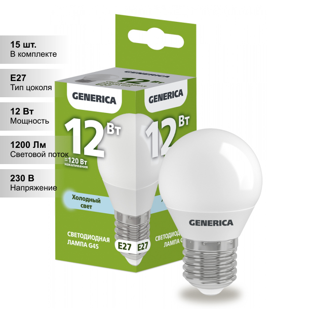 Купить (15 шт.) Лампа LED G45 шар 12Вт 230В 6500К E27 GENERICA