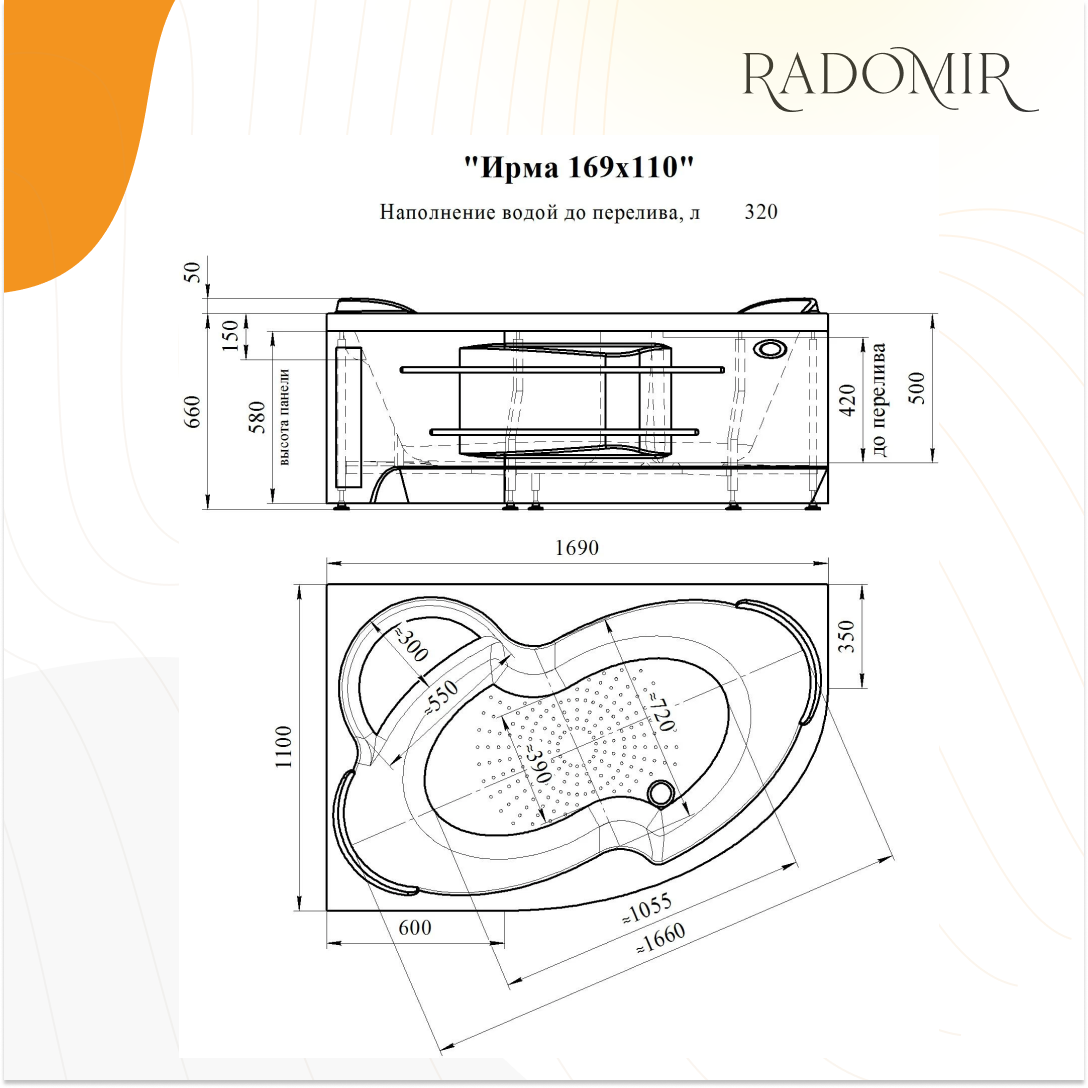 Ванна акриловая Радомир Ирма, 169х110 (левая) фронтальная панель, полотенцедержатель, каркас интересное: