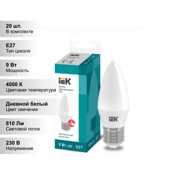 (20 шт.) Светодиодная лампочка IEK свеча C35 E27 9W(810lm) 4000К 4K ECO LLE-C35-9-230-40-E27 Нейтральный белый. Цоколь E27