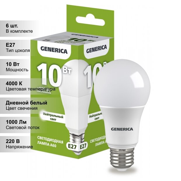 Сохранить(6 шт.) Светодиодная лампочка GENERICA A60 груша 10Вт 230В 4000К E27 интересное: