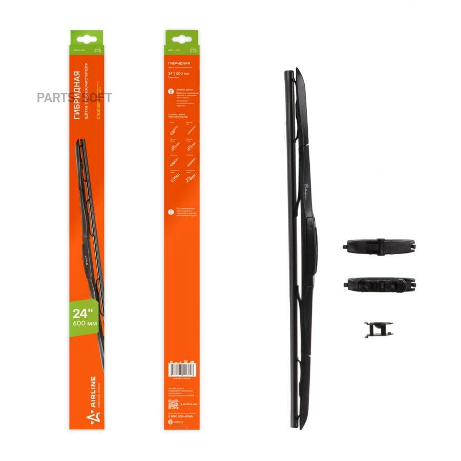 Щетка стеклоочистителя гибридная 650 мм AIRLINE AWBH650 + 3 адаптера для а/м Audi, Hyundai, Kia, Nissan, Peugeot, Toyota, Volkswagen, Volvo
