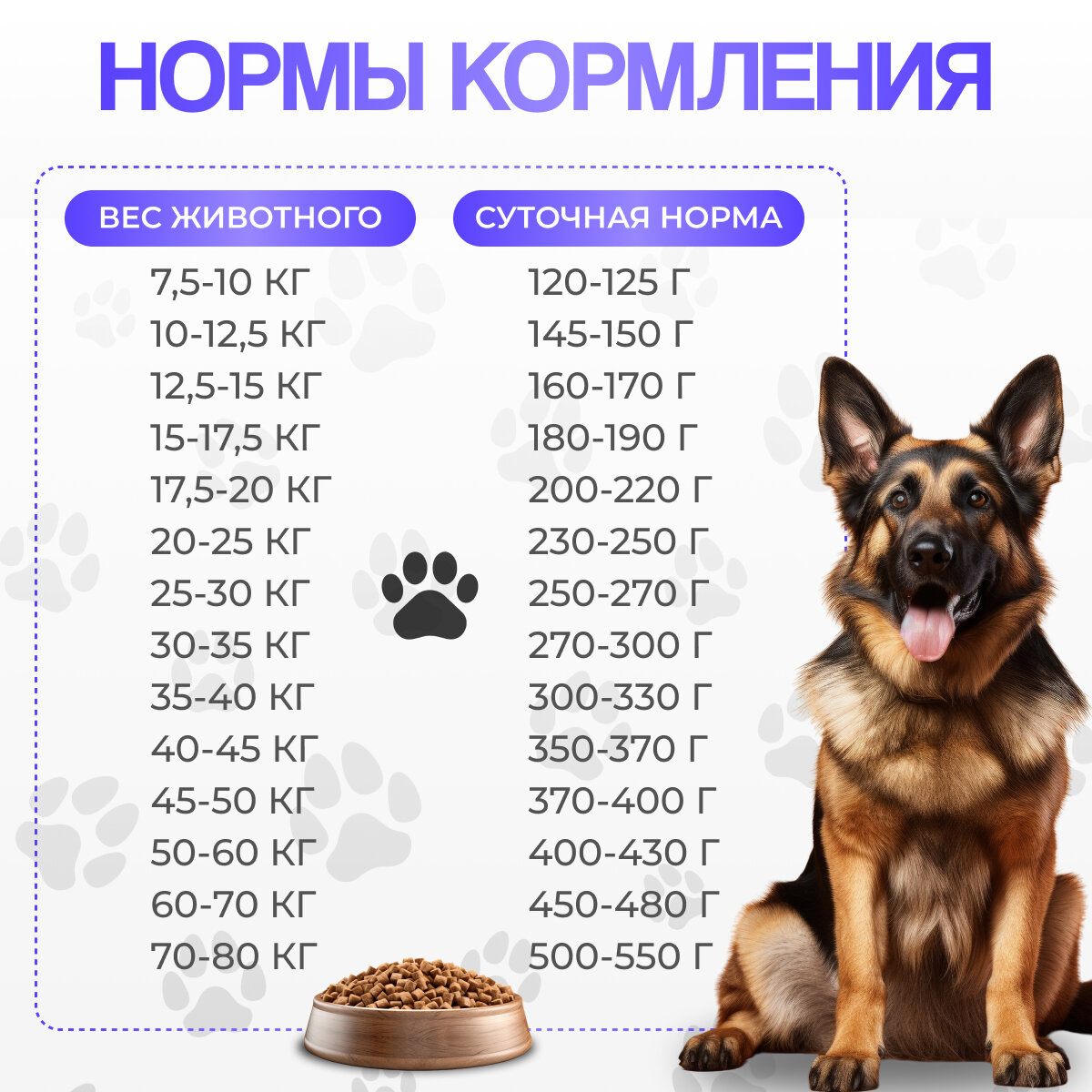 | Дозировка | - 2-5 кг: 55-70 грамм в день - 5-7.5 кг: 90-95 грамм в день - 7.5-10 кг: 120-125 грамм в день - 10-12.5 кг: 145-150 грамм в день - 12.5-15 160-170 грамм в день - 15-17.5 180-190 грамм в день - 17.5-20 кг: 200-220 грамм в день - 20-25 кг: 230-250 грамм в день - 25-30 кг: 250-270 грамм в день - 30-35 кг: 270-300 грамм в день - 35-40 кг: 300-330 грамм в день - 40-45 кг: 350-370 грамм в день - 45-50 кг: 370-400 грамм в день - 50-60 кг: 400-430 грамм в день - 60-70 кг: 450-480 грамм в день - 70-80 кг: 500-550 грамм в день |