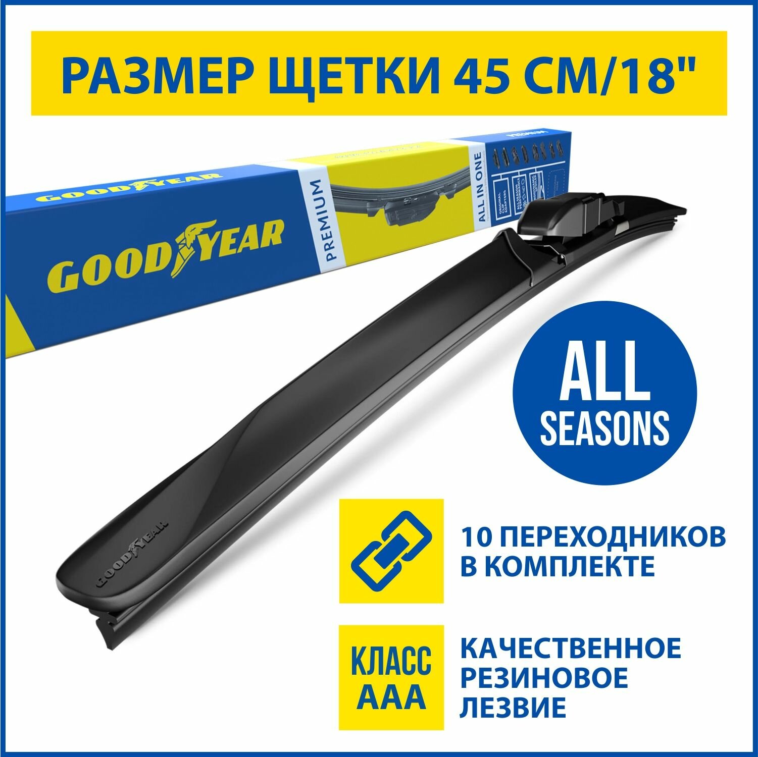 Щетка стеклоочистителя бескаркасная GoodYear PREMIUM 18"/45 cm всесезонная, 8 переходников GY000438