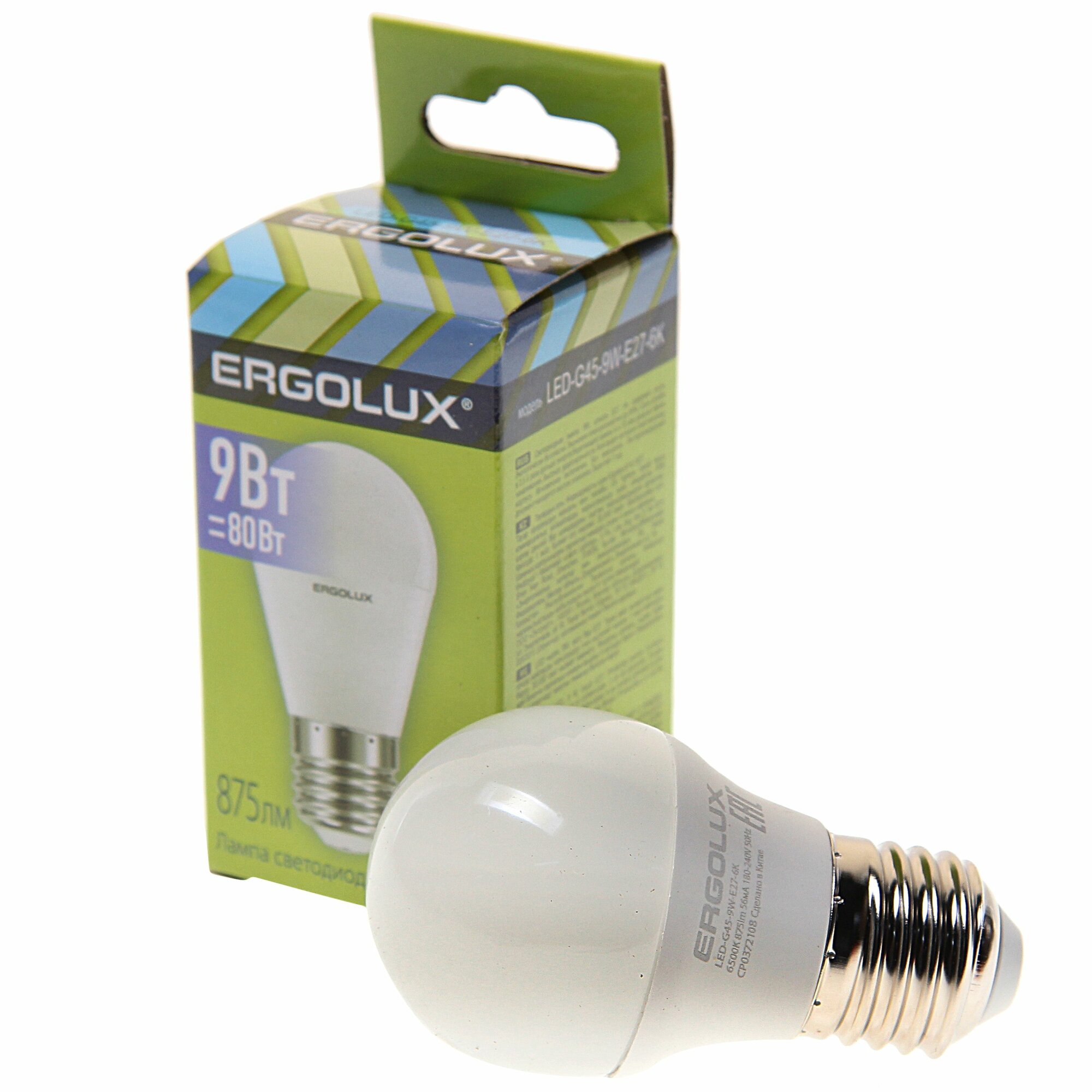 Лампа светодиодная Е27 G45 9W (80W) 220V холодный, LED-G45-9W-E27-6K, ERGOLUX