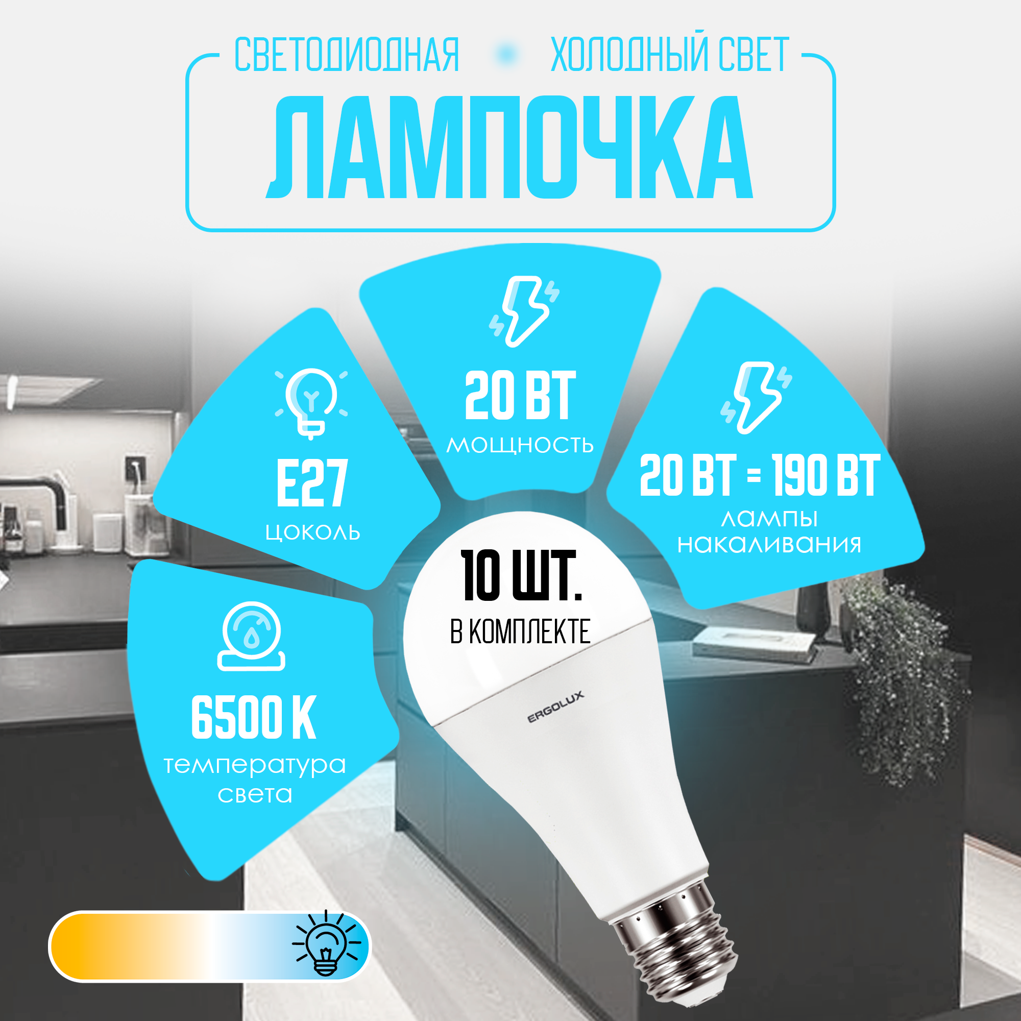 Лампа светодиодная E27, 20 Вт, 190 Вт, груша, 4500 К, свет холодный белый, Ergolux