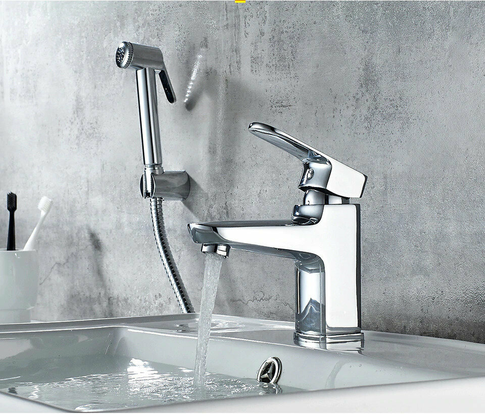 Однорычажный смеситель для раковины (умывальника) с гигиенической лейкой (душем) Ledeme L1254 хром, латунь