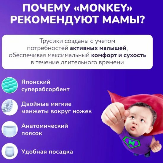 Momi MONKEY японские подгузники трусики детские 9-14 кг, размер 4 L, 44шт