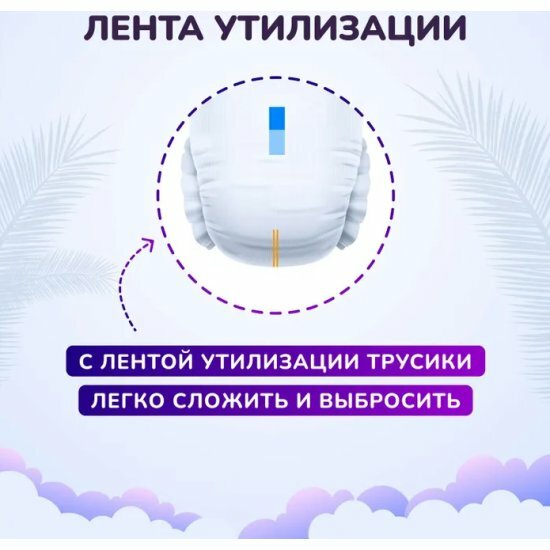 | Дополнительная информация | бесшумная закрепляющая лента; способ применения: просуньте ладони в проёмы для ножек, затем вставьте в них ножки малыша. Если малыш стоит во время смены трусиков, то лучше, чтобы он держался за Вас, просовывая ножки поочередно. Подтяните трусики до уровня, когда пупка не будет видно Расправьте поясок, манжеты и резинки-барьерчики. Проследите, чтобы манжеты и барьерчики не были загнуты внутрь трусиков, а обхватывали ножки. Для этого проведите изнутри пальцами вдоль манжетов и барьерчиков - они расправятся и займут правильное положение. Снимите трусики-подгузники, как обычные трусики, Для быстрого снятия наполненных трусиков просто разорвите боковые швы на резинке |