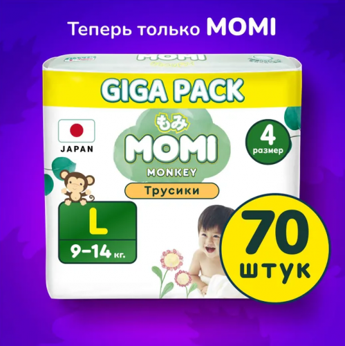 Трусики-подгузники Momi Standard/Monkey GIGA PACK L (9-14 кг), 70 шт