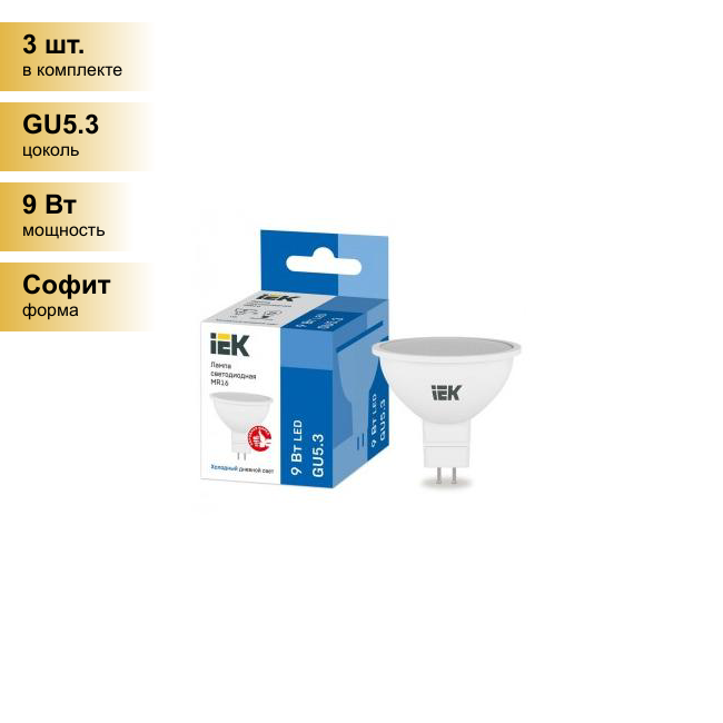 (3 шт.) Светодиодная лампочка IEK MR16 9Вт 230В 6500К GU5.3