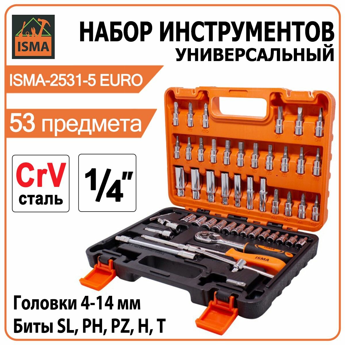 Купить Набор инструментов для автомобиля ISMA-2531-5EURO 53 предмета, Трещотка 1/4"DR, головки 6-гранные (4-14 мм), биты PH, SL, PZ, удлинители
