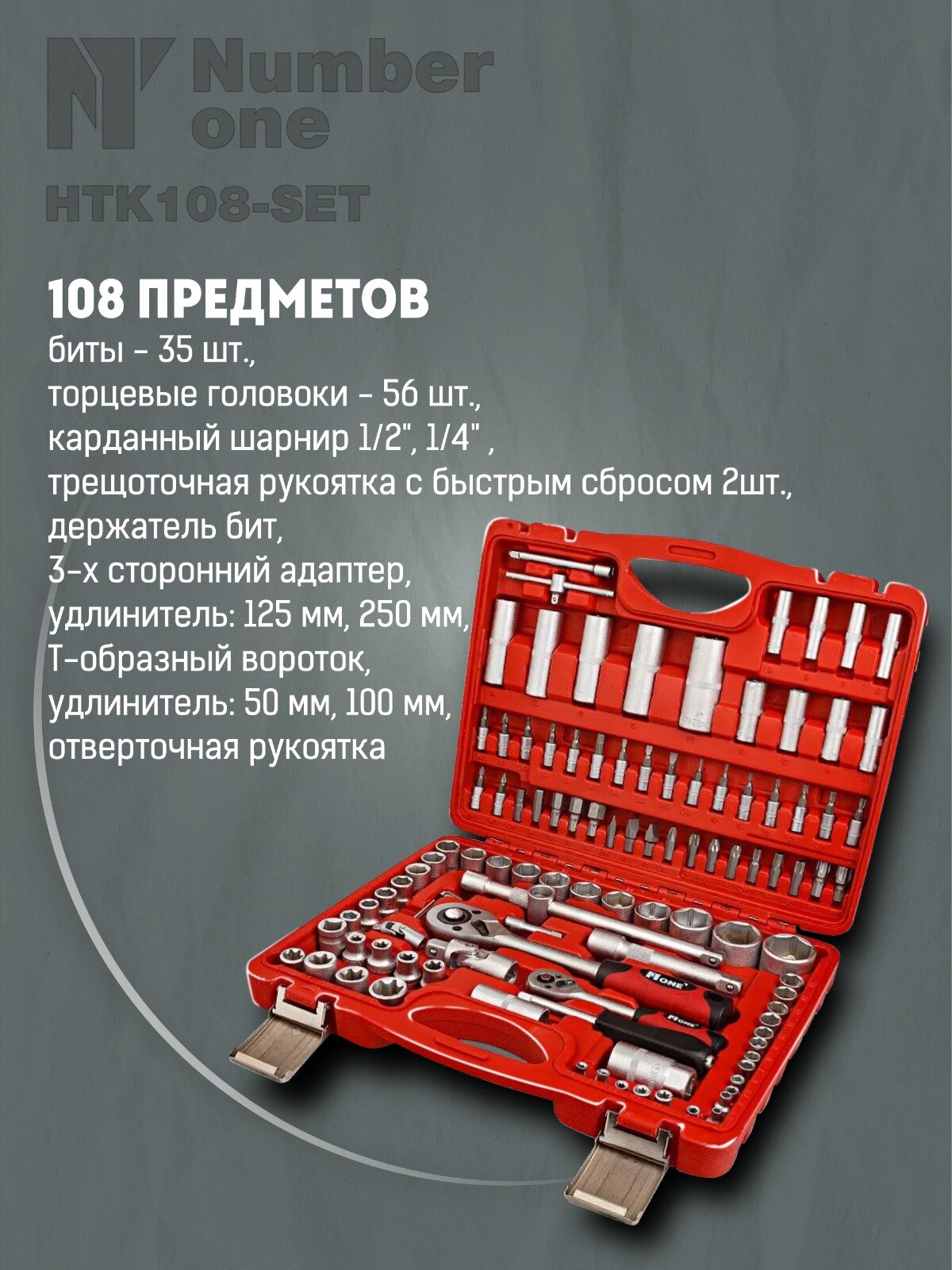 Набор инструментов NUMBER ONE HTK108-SET, слесарные / для дома / для автомобиля, 108 предметов, трещотка / кейс