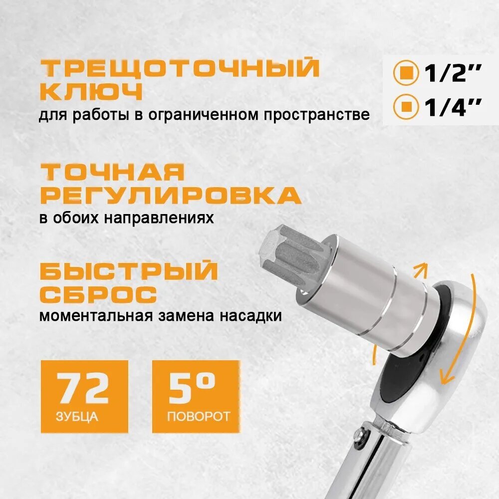 | Головки торцевые подробно | 1/2": 10, 11, 12, 13, 14, 15, 16, 17, 18, 19, 20, 21, 22, 24, 27, 30, 32 мм; 1/2" удлиненные: 14, 15, 17, 19, 22 мм; 1/4": 4, 4.5, 5, 5.5, 6, 7, 8, 9, 10, 11, 12, 13, 14 мм; 1/2" E-Star: E10, E11, E12, E14, E16, E18, E20, E24 мм; 1/4" удлиненные: 6, 7, 8, 9, 10, 11, 12, 13 мм; свечные 1/2": 16, 21 мм; 1/4" E-Star: E4, E5, E6, E7 |