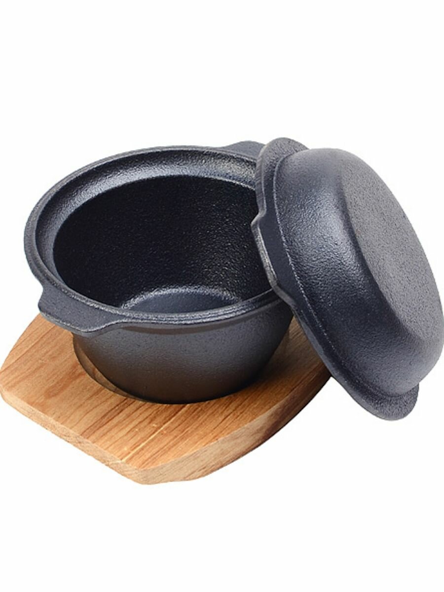 Кастрюля 300 мл. с крышкой и деревянной подставкой чугун