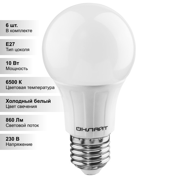 Лампочка светодиодная OLL-А60 Онлайт, 10Вт 220В, цоколь Е27, холодный свет 6500К, 1 шт.