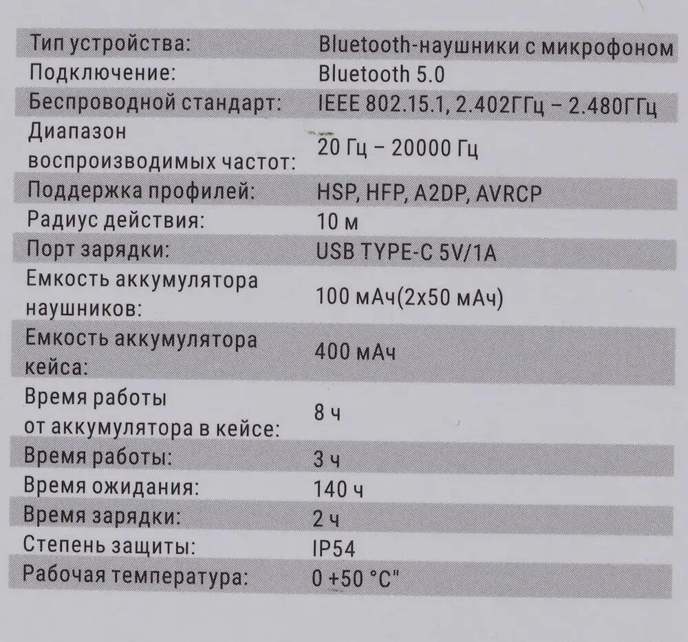 | Емкость аккумулятора (для одного наушника) | 50 мА·ч |