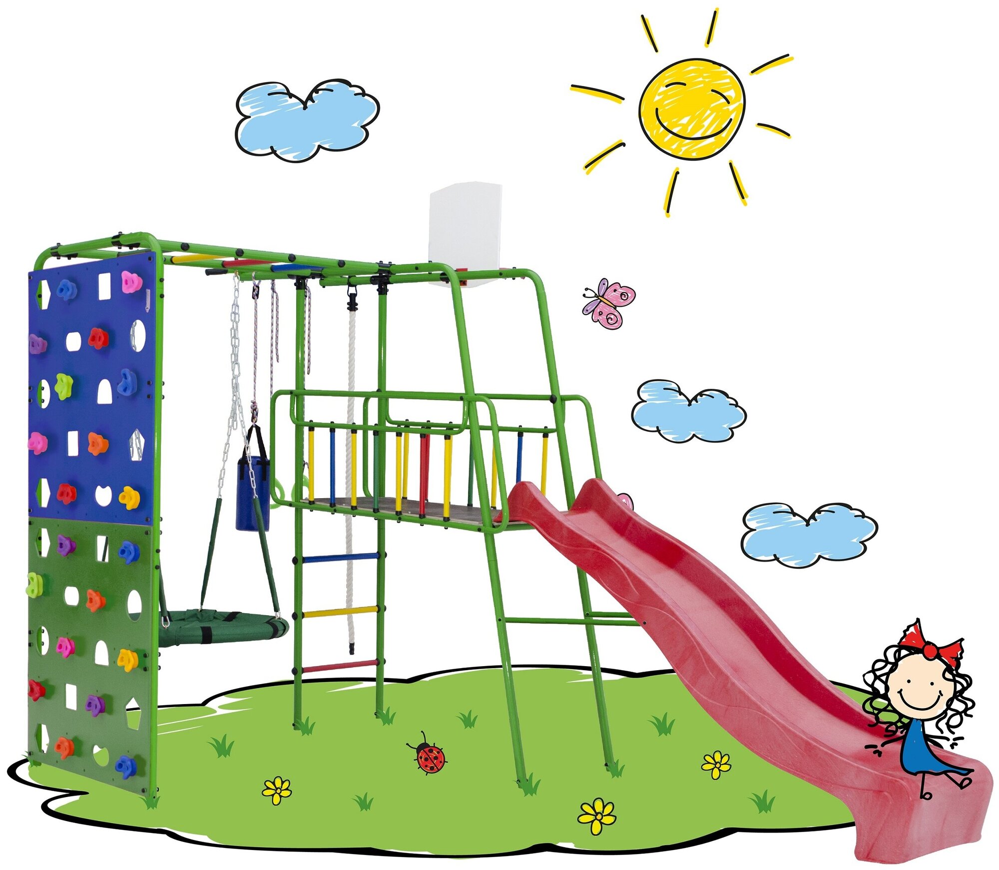 | Дополнительная информация | допустимая нагрузка на навесное оборудование: 80 кг; количество горок: 1; количество качелей: 1 |