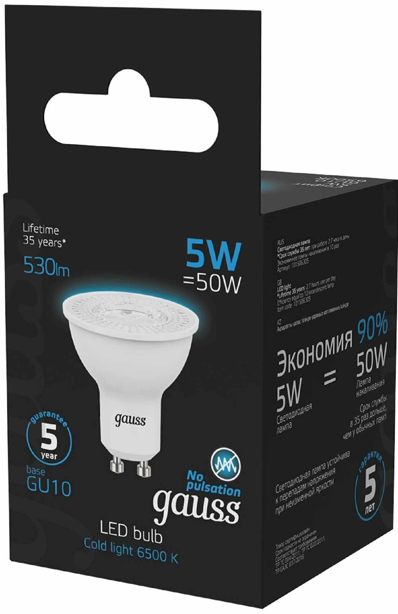 Светодиодная лампа Gauss MR16 5W 530lm 6500K GU10 LED 1/10/100
