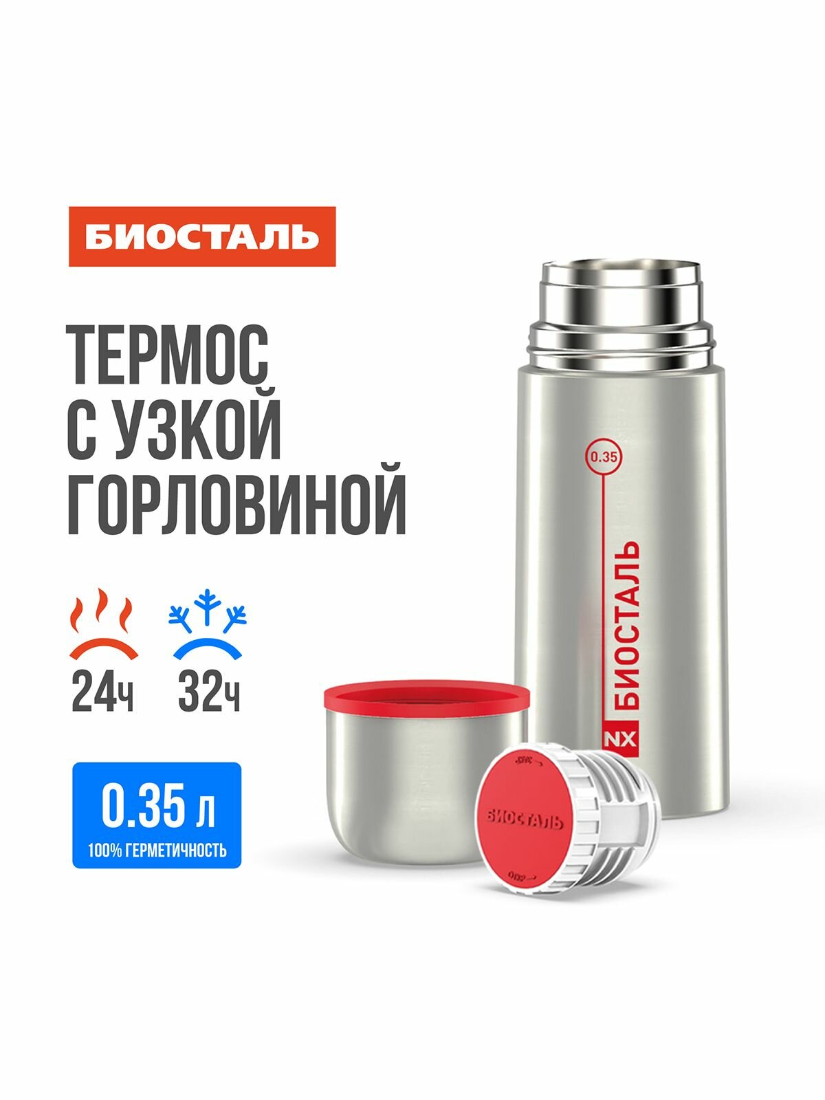 Термос BIOSTAL 350-NX красный с узкой горловиной, объем 0,35л