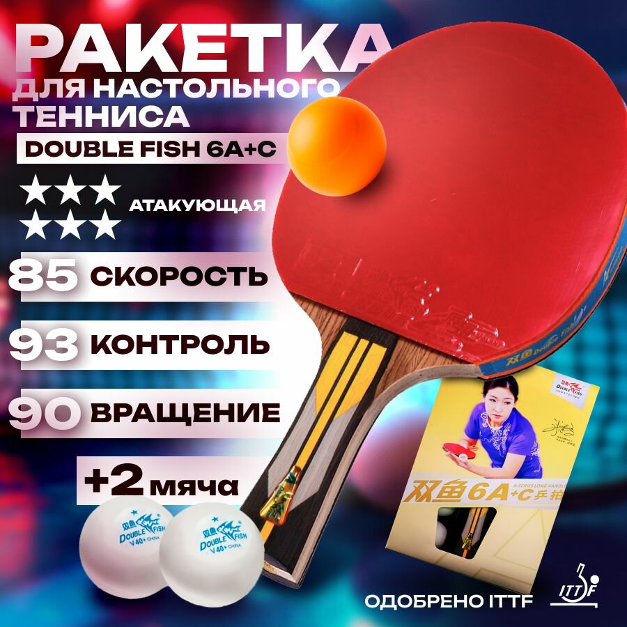 Купить Ракетка для н/т Double Fish, 6A+C, для подвин.,ITTF Appr.,накл. 2,1 мм, конич. ручка+ 2 мяча V40+мм