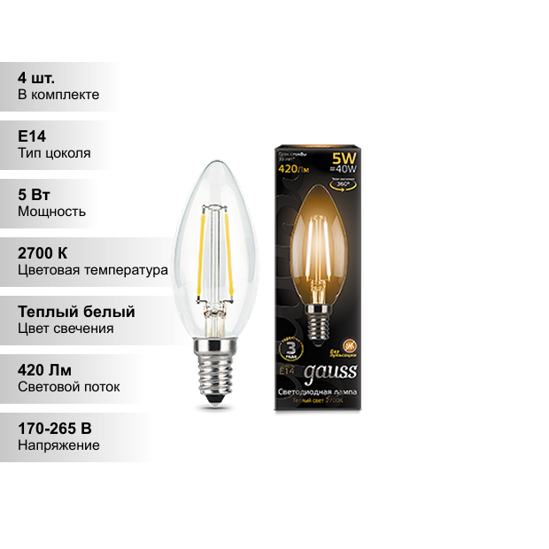 Купить (4 шт.) Светодиодная лампочка Gauss Candle С35 5Вт 150-265В 2700К E14 филамент.