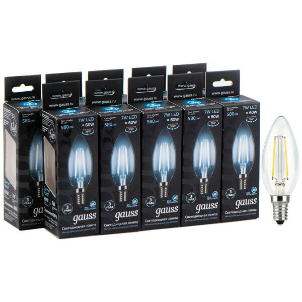 Упаковка ламп 10шт Gauss Filament Свеча 7W 580lm 4100К Е14 LED 1/10/50